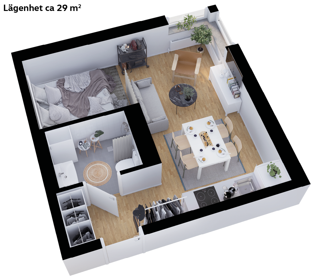 Detaljer i 3D bilderna samt skala och mått kan avvika från verkligheten. Lägenheten kan förekomma även med spegelvänd planlösning.